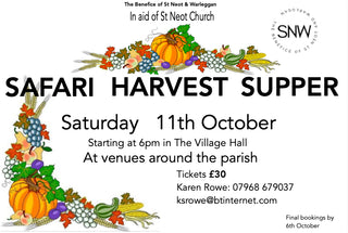 SAFARI HARVEST SUPPERSaturday, 11th October. 6pm The evening began at 6pm with a sherry and starter in the village hall. We were then told which of four venues to eat our main course of roast beef and an abundance of vegetables! At 8.15pm we departed again to one of two venues for dessert and then back to the Village Hall at 9pm for cheese and biscuits to finish off the evening! The hard work preparing for this event was certianly worth it. Everyone had a marvellous time.