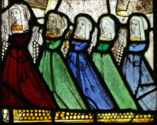 The design was intentionally kept simple so that it didn't detract from the beauty of the medieval painted and stained glass windows. The three colours used for the kneelers were the dominant colours in the windows. Red and green being Liturgical colours and blue representing the Madonna. The kneelers in the Chapel of All Souls reflect the three colours used plus the rich purple and gold of the Noah window. Green for the background accords with the Creation. A pair of kneelers in the Chancel were made for use at Confirmations, with the design of the ascending Dove representing the Holy Spirit. The initials on the kneelers signify either the worker, or in some cases the person in whose memory it was given.