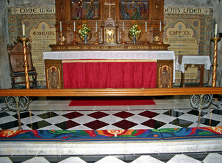The Altar-rail kneeler (pictured below) were given by Major & Mrs Keeble in memory of their son who had recently died. The Kneeler is made of five parts each 4 feet wide. The design, which is modern, runs across the whole. There is a candle, each slightly different, on each section which complements the candle on the Bishop's Chair, it represents the Light of the Spirit. The colours are brilliant to reflect the colours in the great EastWindow.