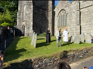 A beautiful evening! Bishop David came along to S Neot to join The Reverend Garry Swinton and the crowd of villagers as they walked from the village carpark to the church yard where the old oak branch was thrown down and a new one hoisted up to the top of the tower.